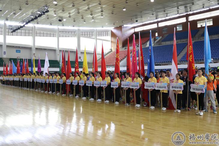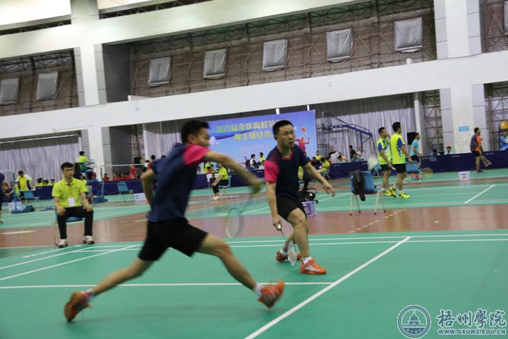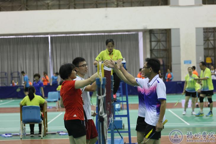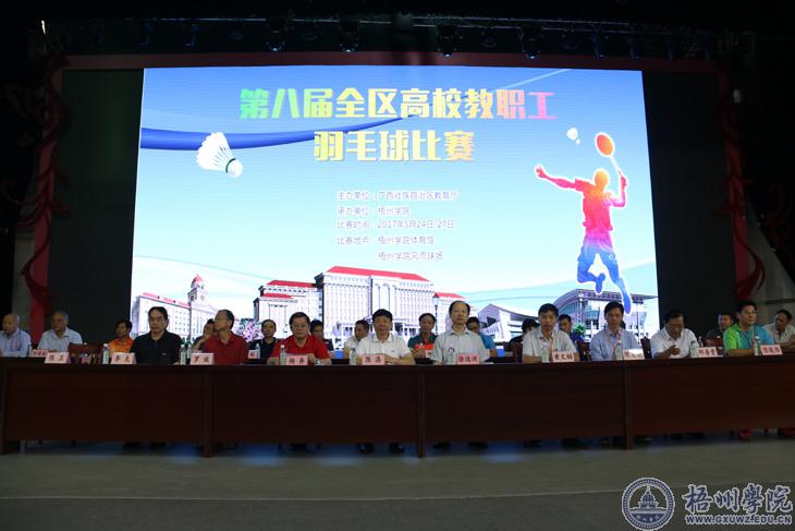 5月24日上午,广西第八届高校教职工羽毛球比赛开幕式在我校体育馆三楼举行。自治区教育厅原正厅长级领导陈洛,梧州市人大常委会副主任徐远洲,我校校长杨奔,各参赛队的领队、教练、运动员和全体裁判员参加了开幕仪式。