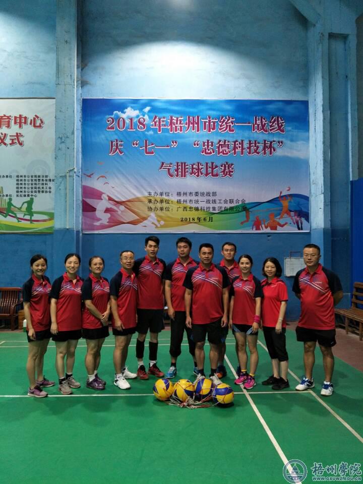为贯彻落实党的十九大精神,庆祝中国共产党成立97周年,同时加强统一战线交流,增进友谊,6月22-23日,2018年梧州市统一战线庆“七一”“忠德科技杯”气排球比赛顺利举行。我校由党委统战部、各二级党委(党总支)、直属党支部代表组成的统战代表队,连同梧州市各统一战线共24支队伍参加了比赛。赛场上,队员们攻守往来,接球、传球、扣球、拦网……奋力拼搏的精神鼓舞着大家,场外的队员激情无限的加油呐喊声,引起了全场观众的关注。经过奋力拼搏,我校取得第五名的好成绩,充分展示梧州学院人顽强拼搏、永不放弃的风采和团结协作的精神。