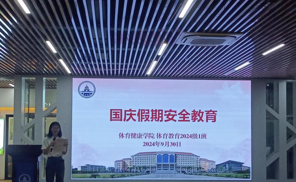 为进一步加强我院学生国庆假期安全教育,强化学生安全意识,9月30日下午,我院组织体育教育2024级1班召开“国庆假期安全教育”主题班会,学院党总支书记甘阳出席会议,学院辅导员及班级全体同学参加会议。